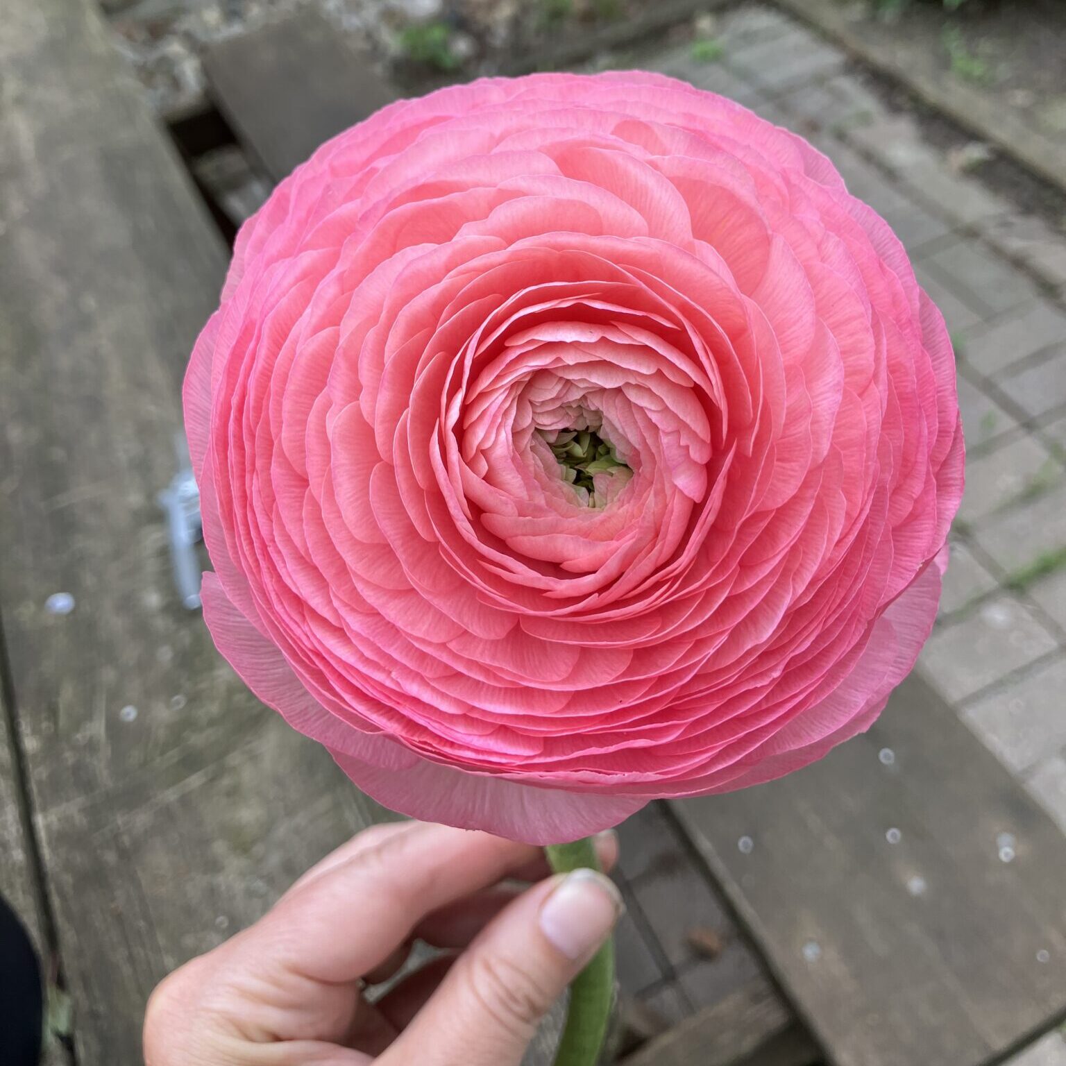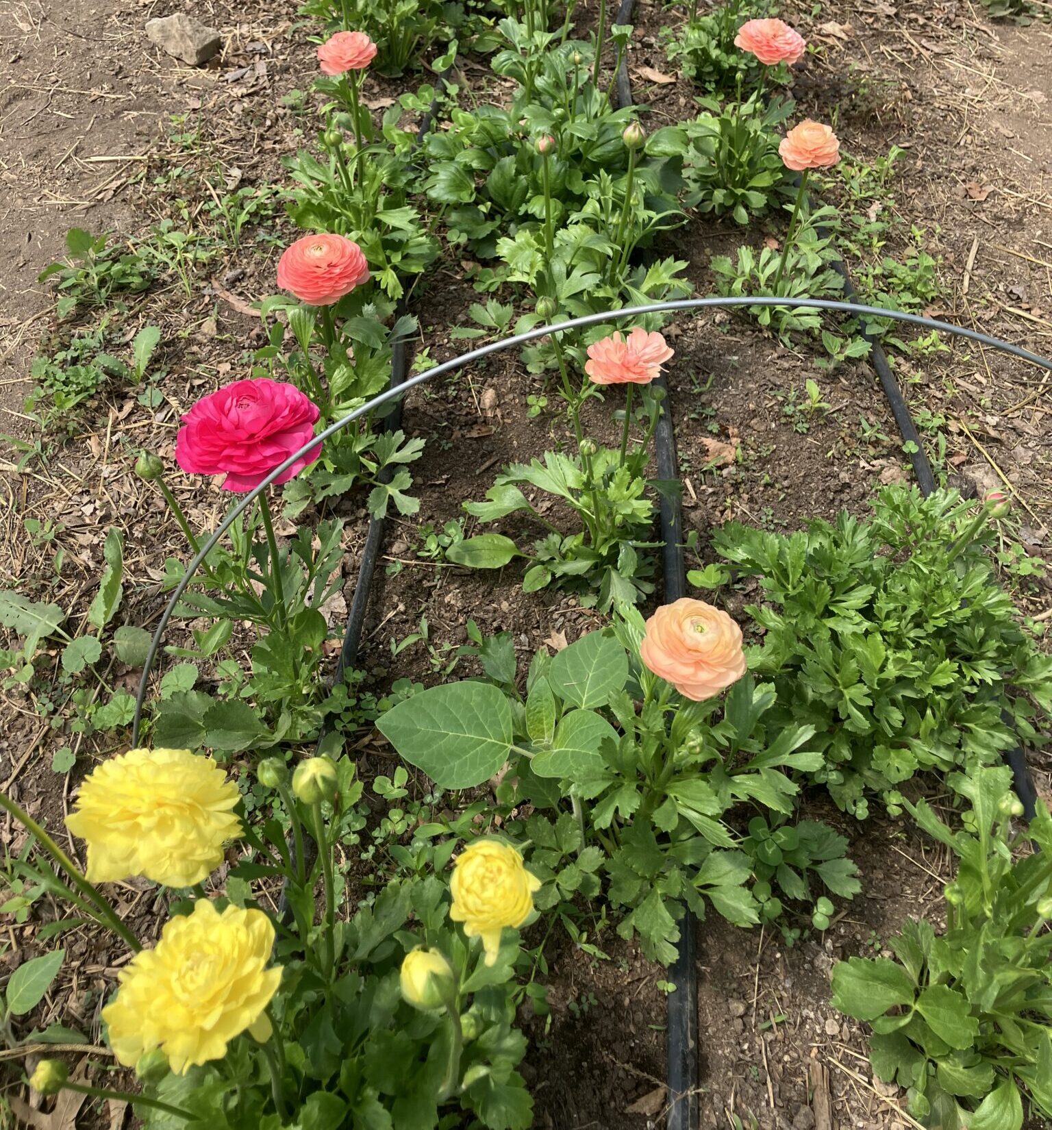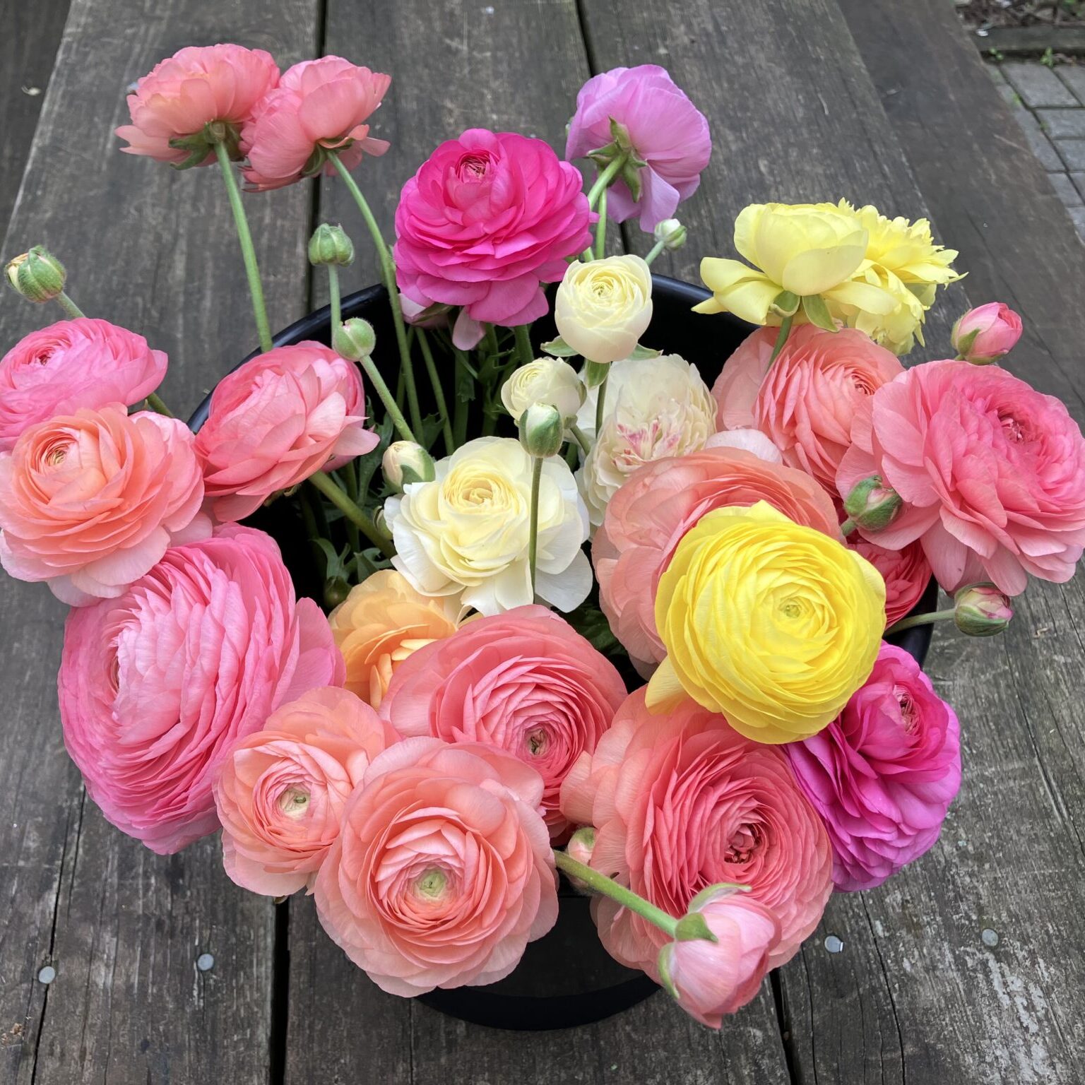 Ranunculus take about 90 days from start to finish. They will start to put on their spectacular show in early spring and then start to slow down when it gets too hot (very relatable!). Our corms started in early February will be finished by early June. We then wait for the flowers to completely die allowing the plant to focus those nutrients back to the source… the corm. We then dig up the corms, let them dry out and then hang them in a cool dry place in a mesh sack until we start the process all over again in February. Corms can continue to produce year after year if handled and stored properly. It’s an investment that is clearly worth it, not only for their long shelf life, but also for their magnificence. I mean, look at these beauties! Okay let’s try again, run-nung-kyuh-luhs. Or you can call them by their other name, Persian Buttercups. It’s sweet right? Stop by the farm in May to catch the stunning, but swift display!